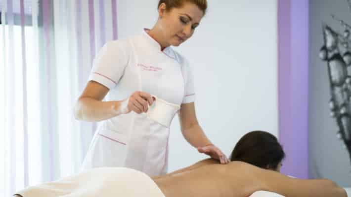 A professional massage therapist pouring warm oil on a client’s back for a relaxing massage.