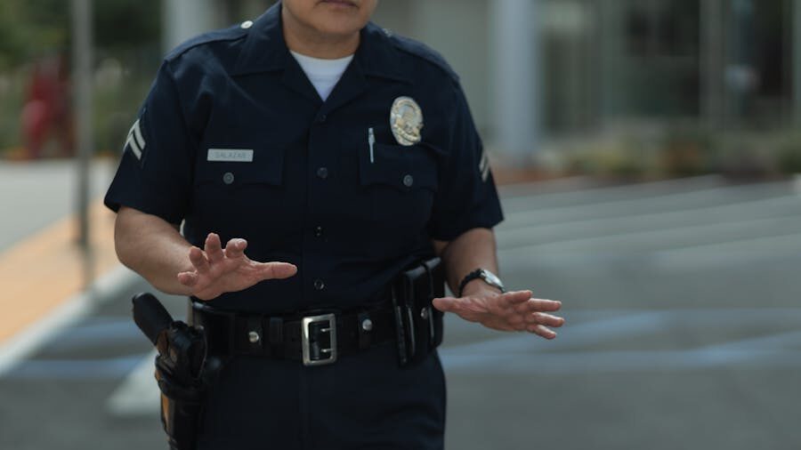 A police officer in uniform stands outdoors with both hands raised, signaling to stop.